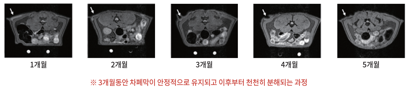 - 수화 후 4~6개월 동안 체내로 흡수되어 장기간 안정적인 차폐기능을 유지
