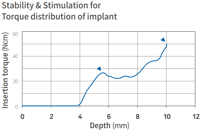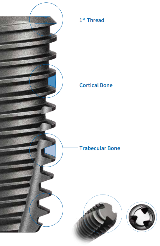 Taper 상부의 Thread 두께는 Bone Pocket 공간을 늘려 초기 고정력 및 과도한 최종 토크 발생을 방지하는 Design